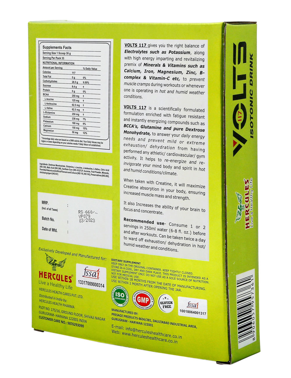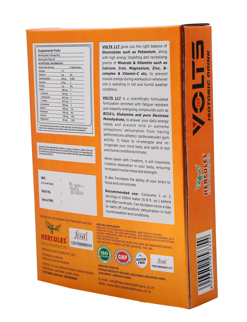 VOLTS 117 is a scientifically formulated formulation enriched with fatigue-resistant and instantly energizing compounds such as BCCA’s, Glutamine, and pure Dextrose Monohydrate, to answer your daily energy needs and prevent mild or extreme exhaustion/ dehydration from having performed any athletic/ cardiovascular/ gym activity. It helps to re-energize and reinvigorate your mind body and spirit in hot and humid conditions/climates.